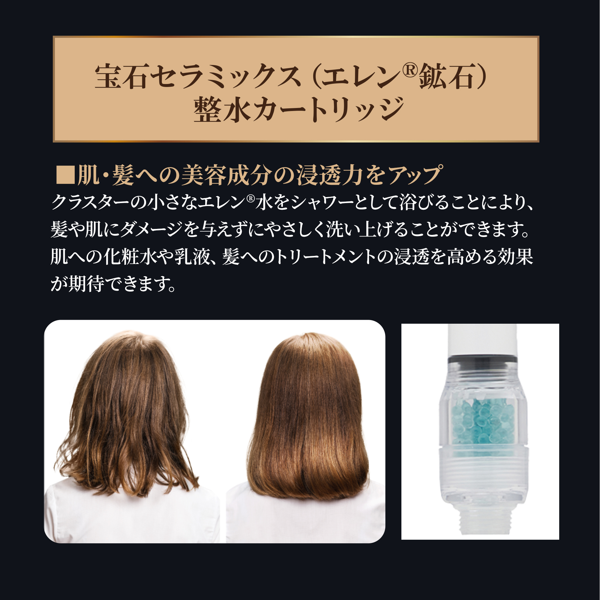不純物を取り除いたエレン®水をシャワーとして浴びることにより、髪や肌にダメージを与えずにやさしく洗い上げることができます。