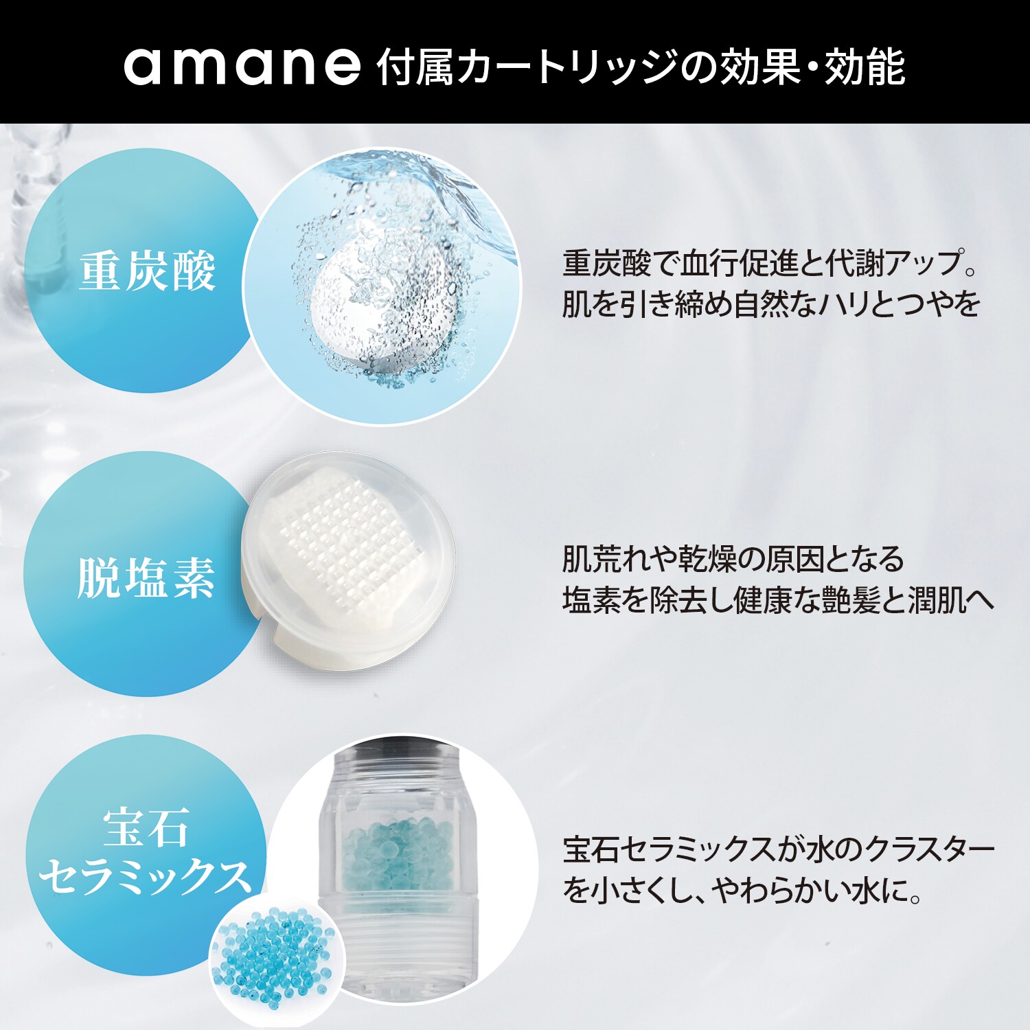 シャワーヘッド「amane」シリーズ全てに使用できます。ホットタブシャワー1錠をカートリッジにセットし、amaneのシャワーヘッドへ取り付けてください。配合成分(ビタミンC)が水道水の残留塩素を中和し、汚れや不要な角質を浮き上がらせます。じわじわ溶け出たそのパワーが8分間持続します。