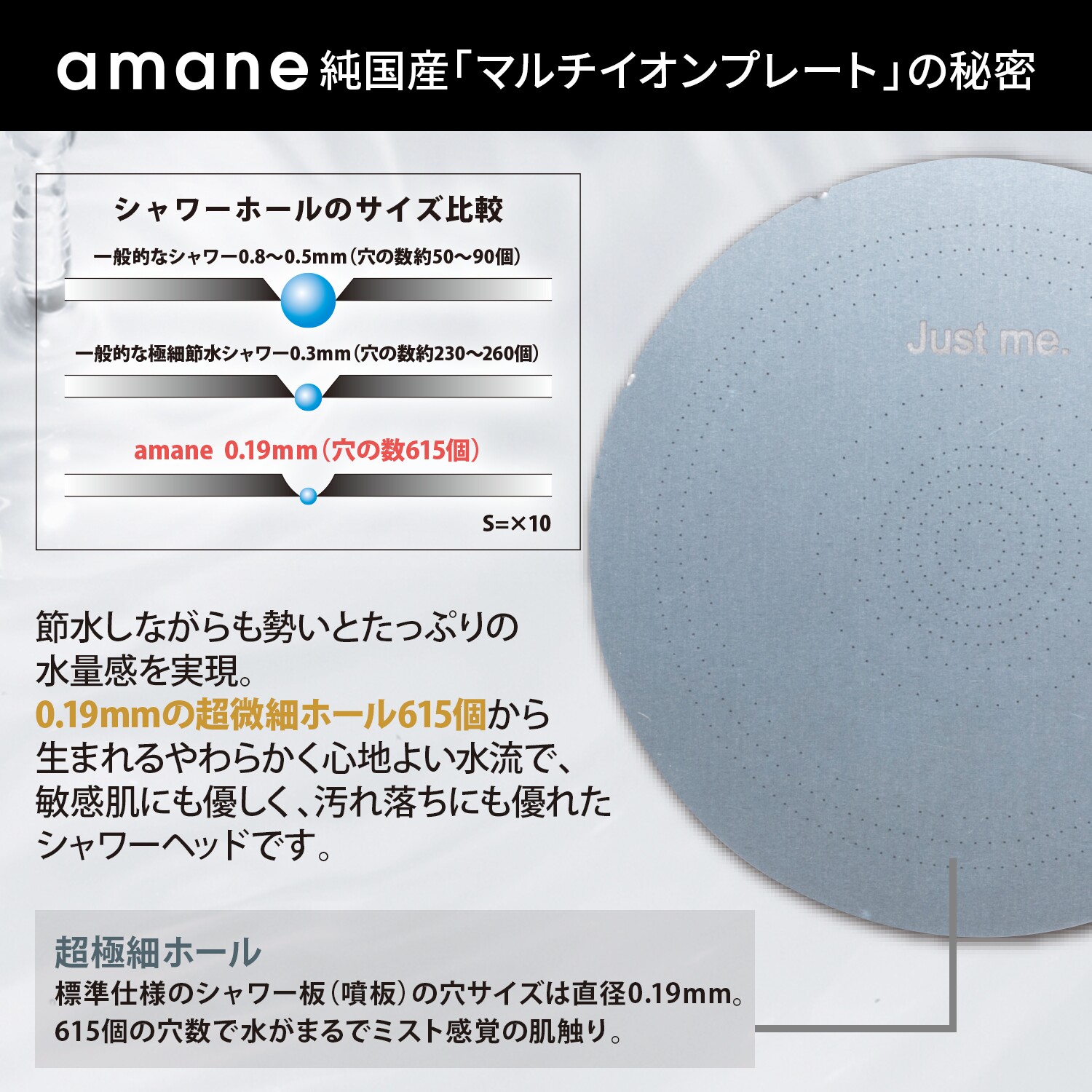 低水圧でも高速水流。一般的な非節水シャワーヘッドの2倍以上の勢いに! 超極細ホール標準仕様のシャワー板(噴板)の穴サイズは直径0.19mm。