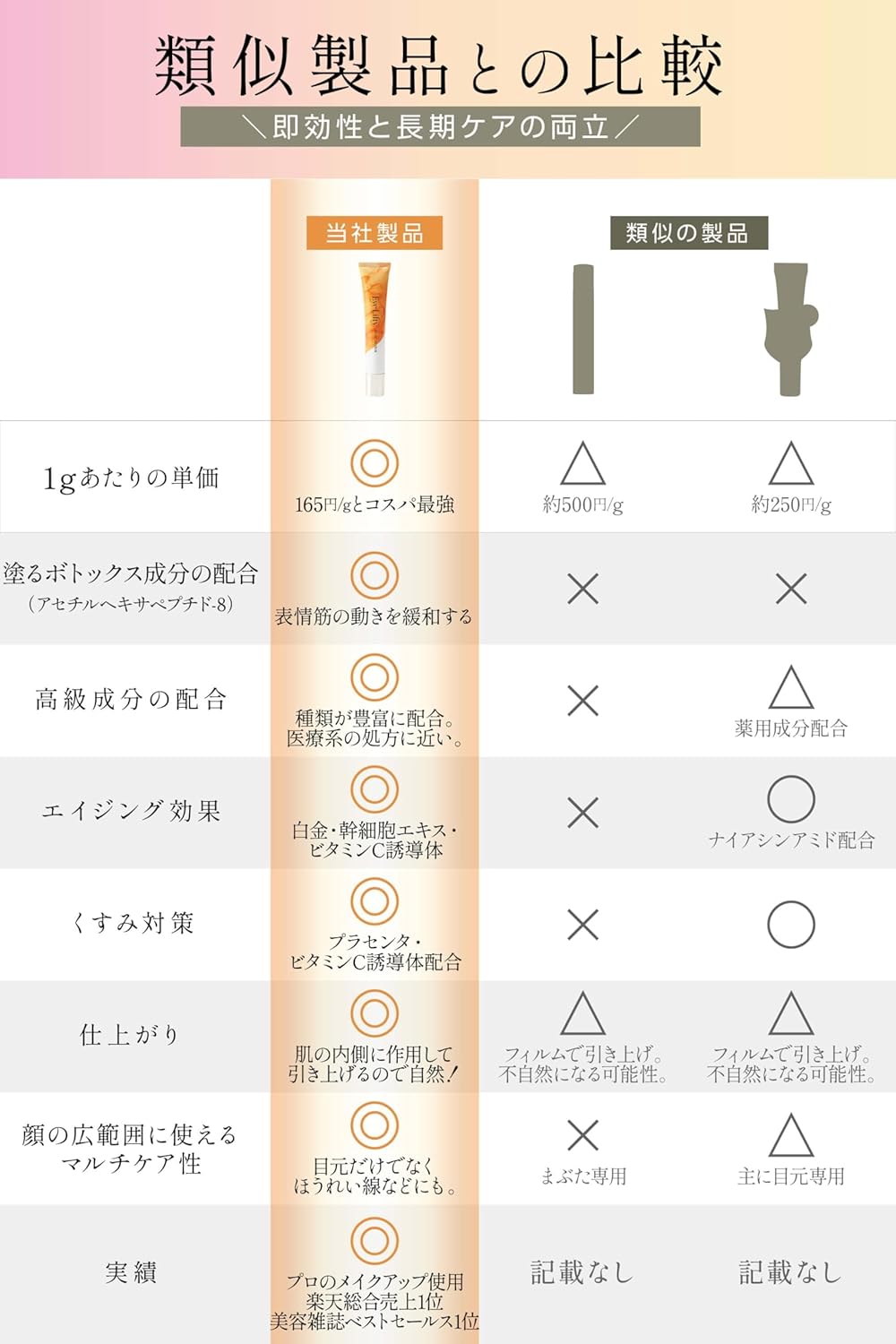 | 使用方法 | 適量を指先にとり、気になる部分に数回なじませてください(目安:1ヶ所につき、お米粒1粒弱が目安)。なじませたら5秒間シワを手で伸ばしていただき、1分間は表情を動かさずに乾くのを待ちます。乾いたのを確認してからメイクをしてください。ポイント塗りにだけご使用ください。 |