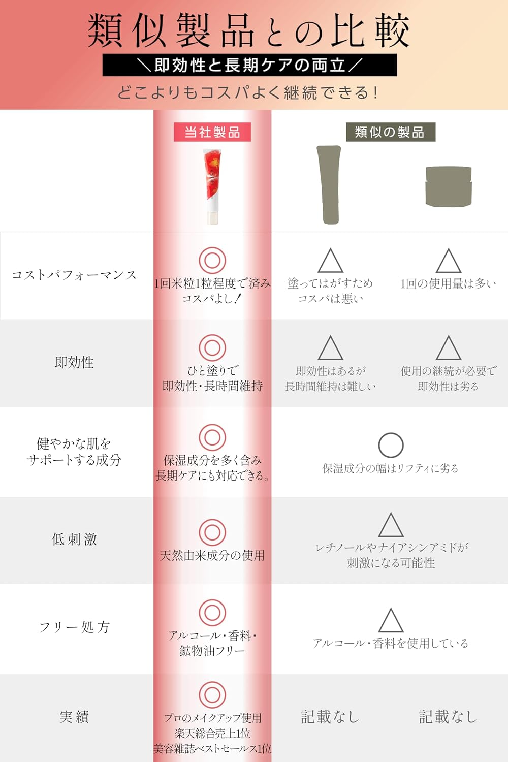 【コストパフォーマンスに自信あり】即効性と中長期的な効果の両方が期待でき、1回の使用量も米粒1粒程度と少ないので、コストパフォーマンスに定評あり。