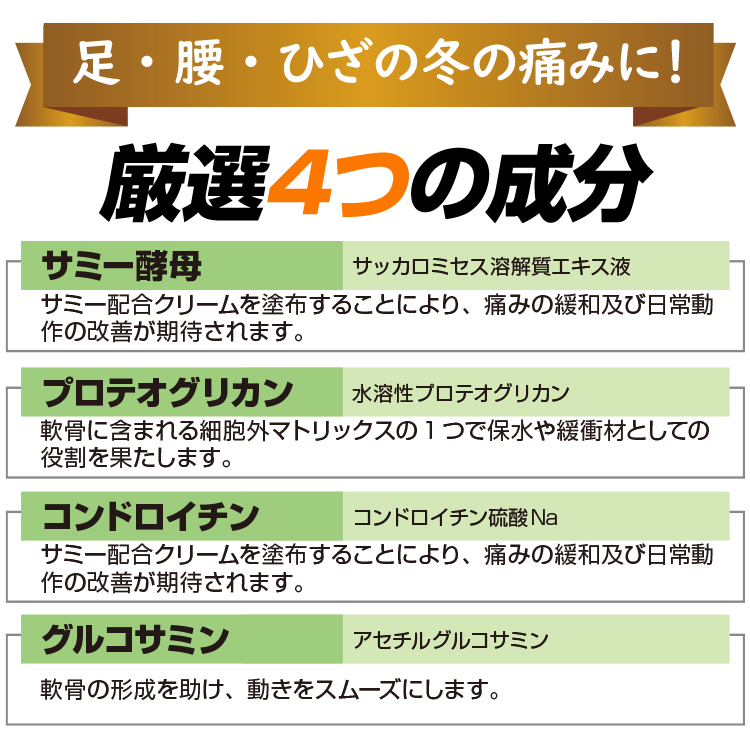 関節のお悩みをサポートするサミー酵母入りの温感クリーム。
