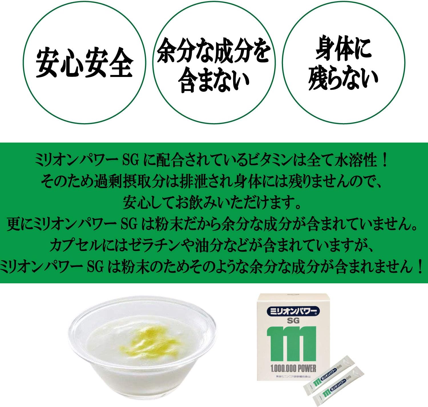 【体に残らず、粉末だから余分な成分を含まない】ミリオンパワーSGに配合されているビタミンは全て水溶性。そのため過剰摂取分は排泄され、身体には残りませんので安心してお飲みいただけます!更にミリオンパワーSGは粉末だから余分な成分が含まれていません!カプセルにはゼラチンや油分などが含まれています。ミリオンパワーSGは粉末ですのでそのような余分な成分が含まれません!