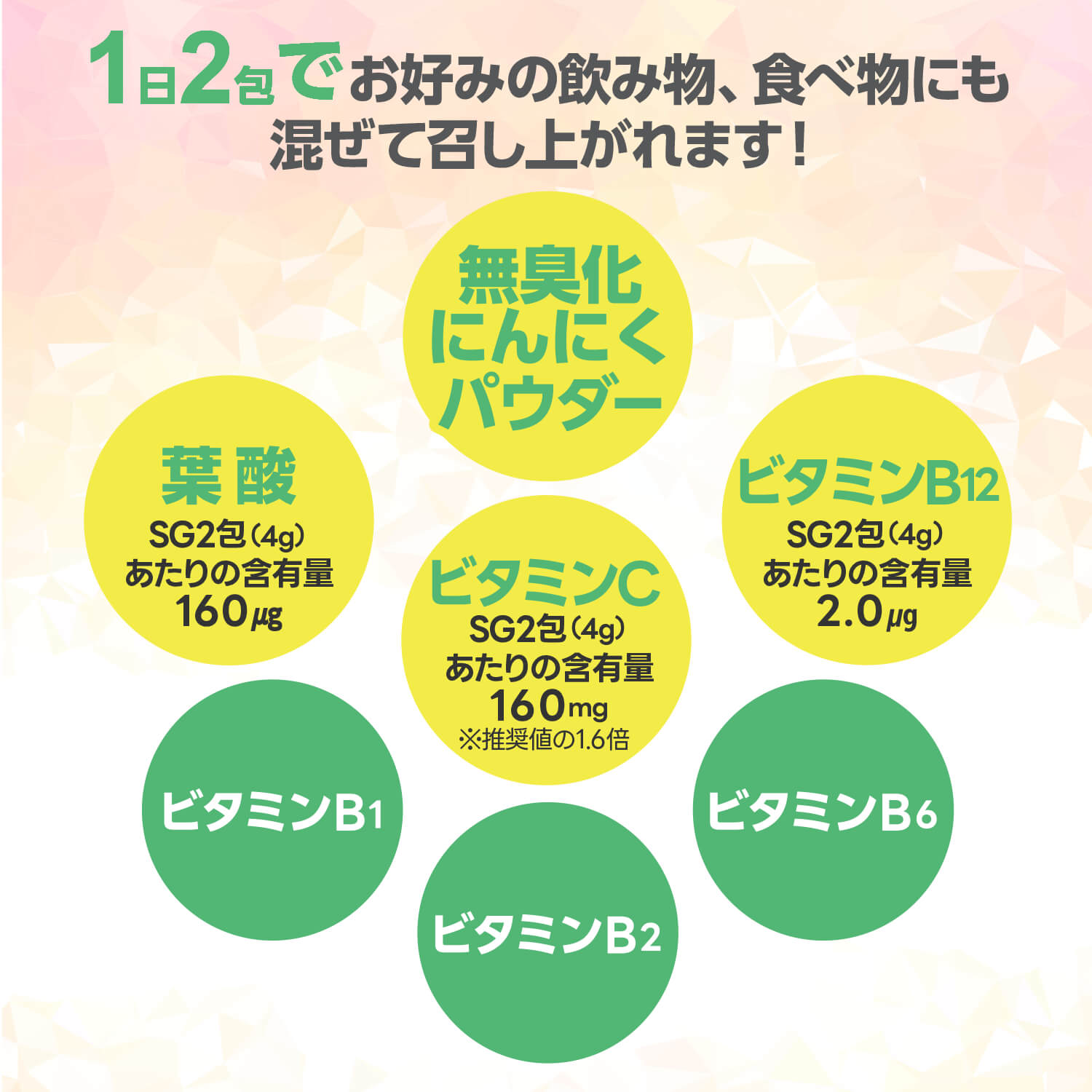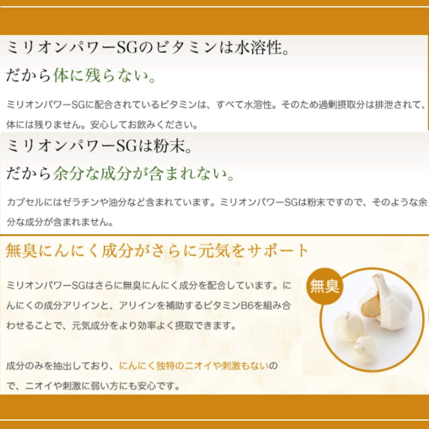 【"無臭化"にんにくを使用!】ミリオンパワーSGは葉酸ビタミン、無臭化にんにく成分を配合しています。にんにくの成分アイリンとアイリンを補助するビタミンB6を組み合わせることで、元気成分をより効率よく摂取できます!