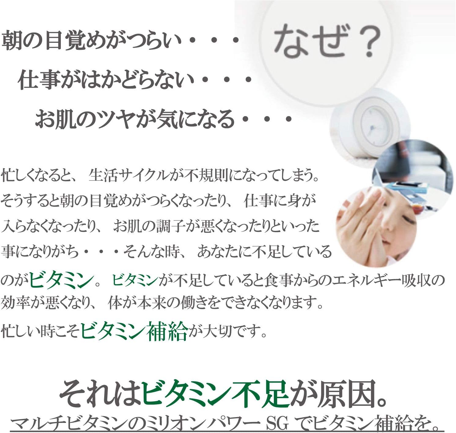 【不足しがちなビタミンB群を最大限配合】忙しくなると生活サイクルが不規則になり、食事のバランスが乱れがちです。不足しがちな元気のビタミン=ビタミンB群を最大限配合し、美のビタミン=ビタミンCと、元気の象徴・にんにくを無臭化したものを配合した健康食品です。